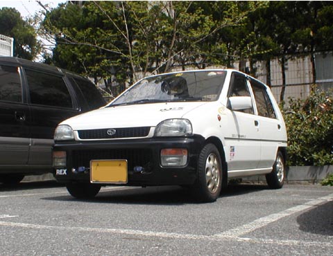 | 平成2年式 レックス CX−i(KH3)改 塗装色:#28(シルキーホワイト)+#77(ジェットブラック) エンジン SOHC 4気筒 658cc。 ネット値は46ps/7200rpm、5.5kgm/4000rpm。 伝統の2気筒EKエンジンに別れを告げた先代レックスのEN05を660ccに排気量アップしたEN07。この車はその中でもEMPiを搭載したEN07Eというエンジンを積んでいる。 また、このエンジンは現在でも細かいMCを繰り返し、プレオのMTモデルに搭載されている。 一度スバルの軽自動車に乗ると病みつきにしてくれる軽とは思えないパワフルさが売り。 レックスには他に、キャブ車NA用のEN07AとEMPiS/C用のEN07Zという2種類のエンジンが設定されていた。 EN05とEN07は「CLOVER4」という愛称がつけられていた。 10353キロ走った時点でのトータル燃費(10353km/681.68L))は15.19km/L。60キロ定置走行の24.7km/Lには届かないまでも、10モードの17.4km/Lにさえも遠く及ばず。給油単位の最高記録は23.6km/Lだが、これは神戸→福山を弟が運転したもの。帰りはオイラが運転+タイヤ4本+ホイール4本のため、18.6km/Lまで下がった(^^;) ミッション スバルECVT。TB40P03AB型。 スバルが世界に先駆けて開発、完成させ、ジャスティに搭載した無段変速装置。その後、KG1、KN1レックスにも搭載され、KH1、KP1を経てこのレックスにも搭載されている。ヴィヴィオにも搭載された。 原理はスクーターの変速装置と同じで、スチールベルトを利用して仮想的にギア比を変更していくので、変速ショックがないというのが売りだった。トルコン車(普通のAT車)と違い、クリープ現象も発生せず、AT車の急発進事故が多発した当時としては安全にも配慮した超高性能変速装置だったのである。 ああ、それなのに…。 電磁クラッチが原因の低速時のギクシャクや、トルコンユーザーからの「クリープがないのは不自然」という声が間違いなくECVTの寿命を縮めてしまう…。FIATのパンダや日産のマーチ、キューブにも搭載されたが、両者とも現在はCVTの設定そのものがなくなってしまった…(FIAT会長の「ECVTの悲劇は最初にジャスティとレックスに搭載されたことだ」発言も効いたのだろうか…)。そして、プレオには発展系のi-CVTなるものが搭載された…。 実際乗ってみると、クリープがない、変速ショックがないというのは、非常に乗りやすいもので、慣れてしまうと普通のAT車に乗るのが馬鹿馬鹿しくなるような気分にさせてくれる(確かに低速時はガタガタするけど…(^^;) 問題はスチールベルト仕様ゆえのトルコン車にはないベルト音と、耐久性が低いらしい電磁クラッチ。 加速しても動かないタコメータを見るのは結構楽しい。 ちなみに、NA・EMPiのECVTは、このMCで新設計された物だったりする。 サスペンション/ショック サスペンションは、360時代からのスバルのこだわりである4輪独立懸架。スポーツタイプならまだしも、バンやNAセダン、はてはトラックまでこのシステムを使用しているスバルのこだわりは、評価されてもいいはずだ。 2WDのこの車は、前ストラット式/後セミ・トレーディング・タワー式(4WDは前後ともストラット式)。 種車であるレックスCX−i(PS/エアコン付)は、全FWDレックスの中でも5DS/CモデルであるVと同じ、総重量900kgという最重量クラスである(最重量はVXオープントップの910kg)。NA車のサスペンションレートは前1.9キロ、後1.8キロ。一番軽いモデルでも同じレートなので、当然のように重い車には厳しい。そのため、ショック/サスペンションともヘタリが早い(と思う)。それを解消するため、スポーツ走行時の安定性確保のため、サスペンションをKH1VX純正品(中古品。前2.1キロ、後2.4キロ)、ショックをKH3VX純正品(前のみ中古品)に換装した。乗り味は堅くなったが、後席に乗る妻には好評で、スポーツ走行時も安定するようになった。少々前屈みになってしまったのはご愛敬だろう。 パワステ付きであるこの車には、前だけスタビライザーが入っている。 ボディ形状 86年にKG1/KN1がFMCで誕生してから、92年にレックスが生産中止になるまで、基本的には形が変わっていない。「荷物を載せること」が最優先である直線重視の「箱形」である。KH1/KP1にMCした時、バンパーが丸くなり、KH3/KP3にMCした時にボンネット部分の延長(60mm)、バンパーの大型化(フロント20mm、リア20mm)を行って今の形になった。 後継車のヴィヴィオに比べると、あまりにも無骨だが、後席に乗る人はレックスの方が頭上が広いらしく、乗りやすいそうだ。当然、荷物も直線形状のレックスの方が乗る(^^;) ホイールベースは2295mmと軽自動車の中では長い方で、そのため、乗り心地もいい(らしい)。反面、4.5mという最小回転半径は、マーチクラスと同じという取り回しの悪さにも繋がった(^^;) タイヤ/ホイール 種車CX−iは145/70R12 69Sのスチールホイール+専用ホイールキャップを装着していた。お買い物カーだった過去から、外装共々傷だらけのホイールを換装すべく、あっちこっちを当たり、VX純正のアルミホイール+社外ラジアルタイヤを譲ってもらった。 VX純正アルミホイール+純正