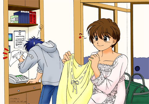 | 春風来たる ハルカゼ キタル 夕暮れ前の街を一つの影が駆けていた。 小学生にも見えそうな小柄な身体に、不釣り合いなほどの大きな鞄を背負って。 それでも、彼女はバランスを崩すことなく、飛ぶように駆けていた。 やがて、その姿は4階建ての小さなマンションの前で立ち止まる。 彼女はひとつの部屋を見上げて、嬉しそうに微笑むと、マンションの狭い入り口に駆け込んでいった。そのまま、最上階へ駆け上がる。403号室の表札を確認して、もう一度嬉しそうに微笑んだ。 ぴんぽ〜ん、ぴんぽ〜ん。 間の抜けたドアホンの音が響く。 だが、しばらく以上待っても返事はない。 「あれ? 確かもう連絡行ってるはずやのになあ…」 彼女はそう呟くと、もう一度、二度とドアホンのボタンを押す。 だが、返事はやはりない。 「しょうがないなあ…。帰ってくるまで待ってよ…」 彼女は夕暮れの空を見上げてそう呟くと、ドアの横に腰を降ろした。 高校の春休みというのはえてして怠惰に流れがちだ。 部活動にでも参加していればそうでもないだろうが、いわゆる無所属だと、宿題さえもないような2週間は、特にその傾向が強い。 この春で、高校2年生になる高遠圭介もそのような怠惰な生活を送っていた。と言っても、大学教授の両親が自身の研究のためにタイへ行ってもう2年になる圭介にとって、この春休みは小遣い稼ぎのためのアルバイトに明け暮れている。それこそ不眠不休でバイトを続けているので、帰るのはは深夜に近い。その日も、そうしてバイト先の喫茶店を出たのは23時を回っていた。 「ほんじゃあ、マスターお先に〜」 「ああ、気をつけてな」 店のマスターはそう言って軽く手を振りながら圭介を見送る。 圭介も背中で軽く手を振って店の勝手口のドアを閉めた。 「あ〜、後何日やったっけか、春休み…」 圭介は指折り数えてみる。 「後2日か〜。バイト三昧やったから、全然休んだ気がせえへんなあ…」 圭介はそう言ってため息をついた。 いくら宿題がないからと言って、張り切りすぎたかも知れない。 「ま、ええか…。学校始まったら、少しは楽になるやろ…」 圭介はそう呟くと、自宅の鍵を取り出した。 圭介の自宅はマンションの一室だ。マンションと言っても、そんなに大きなマンションではない。十数戸しかない小型マンションだ。 軽い足取りで階段を駆け上がり、自分の部屋のある4階まで来ると、部屋の前にうずくまる人影がある。 (なんや…?) 圭介は訝しんで思わず壁に隠れた。そうして壁から顔だけ出してもう一度その人物を窺う。 膝に顔を埋めているので、顔ははっきりと判別できないが、小学生と見まごうぐらいかなり小柄だ。体の線から見ても男だとは思えない。 (はて…?) 今まで女に追いかけられるようないい思いをしたことはない。あれこれといろんな可能性を考えて、最後によく知る人物にぶち当たった。 (その可能性が高いか?) 圭介はそう思うと、わざと普通を装って部屋の前まで歩く。そうすると、うずくまる人影が顔を上げた。 「おにーちゃん!」 うずくまる人影は、満面の笑みをたたえてそう声を上げた。 「やっぱり、真由子か…」 圭介は頭痛がする思いでそう言った。 斉藤真由子は圭介の従妹だ。1歳年下のため、圭介を「おにーちゃん」と呼んで懐いている。彼女の両親も、圭介の両親と同じ大学で、圭介の父の助教授をやっているのだ。そして、真由子の横に大きな旅行鞄。ということは。 「真由子…、なんや、その荷物…」 圭介は真由子の横の鞄を差しながら、そう聞く。 「ああ、これ? わたしの着替えとか、学校の道具とか」 真由子は立ち上がると、スカートの汚れを払いながら悪びれもせずにそう言う。 「叔父さんと叔母さんは…?」 「あれ、連絡行ってへん? 今日からタイの伯父さんとこに手伝いに行っちゃったよ。だから、ここで世話になれって言われて来たんやけど?」 真由子は首を傾げながらそう言う。 「連絡なんか来てへんわ…。なんでいっつも急なんや、叔父さんたちも、ウチの親も…」 圭介は頭を抱えてそう言う。 「え〜、おかしいなあ…? 昼前にファクス流したのに…」 「俺はバイトや! 朝から出掛けて、今帰ってきたんや!」 圭介が真由子にそう言うと、真由子はさすがに苦笑いした。 「まあええわ、あがれ」 「は〜い、お邪魔しまーす!」 渋い表情の圭介に促され、真由子は部屋の中に入っていった。 真由子が居間で荷物の整理を始めたのを横目に見ながら、ファクスの前に立つと、叔母の字で書かれた紙が床に落ちていた。 『夫婦で次春兄さんの手伝いに行ってきます。その間真由子のことよろしくね。家事は全部やるように言い含めてあるから、自由にこき使ってやってちょーだい。なお、いつ帰るかは不明です。よろしくねー』 (叔母さん…) 圭介はファクスの文面を読んでまた目眩がした。 つまるところ、家事を全部やらせるから、真由子を帰ってくるまで面倒見てくれと言うことらしい。 「真由子。おまえ、叔母さん